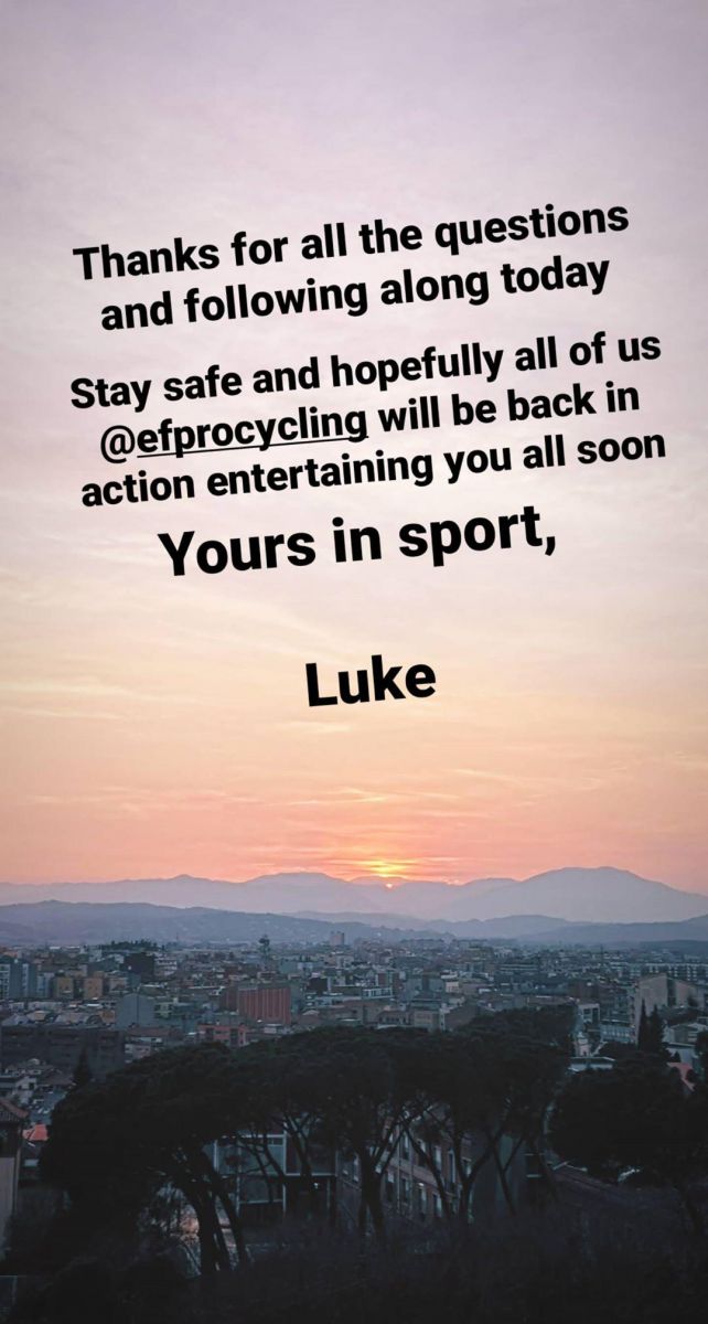 Luke, who lives in Girona, Spain for most of the year, is now working at EF Pro Cycling Service Course headquarters during Covid-19 race interruptions and maintaining EF Cannondale’s bikes. Just like all of us, he is, of course, waiting to get back to the races soon.