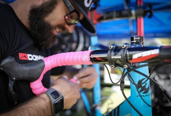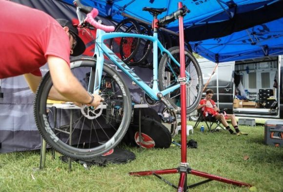 Race day starts with me and an assistant mechanic arriving at least two or so hours before the riders do. Sometimes, if schedule permits, I will arrive earlier and race myself. We first pull all the bikes out and, if necessary, wash them to make sure they are spotless. This also gives us a chance to make sure the pressure washer is working well and we have enough water in the storage tanks. Once the bikes are cleaned we go through each bike from back to front. Checking brakes, pads, shifting, battery charge, and every single bolt. At this point we take a best guess and put on the wheels and tires we think each rider will prefer. The nice thing with having multiple bikes is we can put on different tire setups to make it easier for the pre-race ride. Once the bikes are ready we get the spare wheels prepped. When riders arrive we go over tire selection and dial in the tire pressure for the pre-race ride. We often put their third bikes on the warm-up trainers so we don’t have to do it later. The riders can then get on whenever they want to spin the legs or warm up for the race. When riders return from the pre-race ride we clean the bikes, make sure all the tires are aired up to the desired pressure and every bike is race ready.