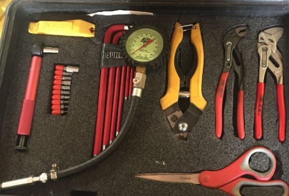 My custom tire pressure gauge is my favorite tool. It’s simple and consistent. The riders and I are all familiar with what the different pressures on the gauge feels like while riding. Unlike a digital gauge, it has no batteries and works well in the cold. Tire pressure can really change the way a bike handles, so nothing beats a tool that makes the process easy and reliable.