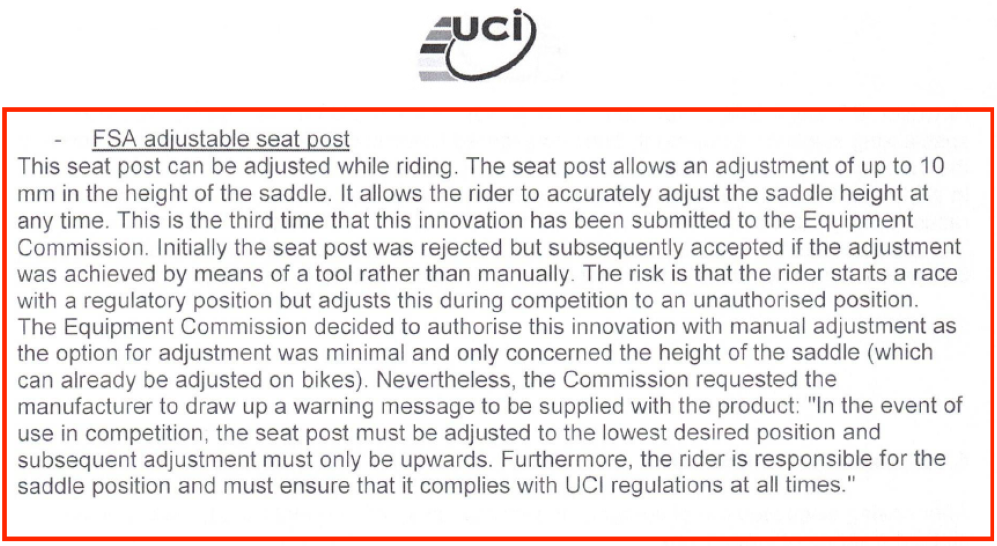 The introduction of this system was possible above all thanks to the modification of the UCI regulation requested by FSA in 2014, which allows the in-race use of adjustable seatposts with a maximum travel of 5 cm.