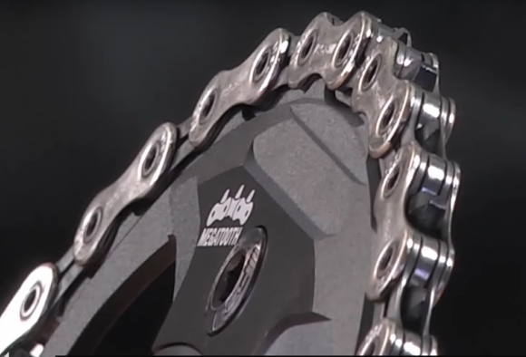 As there’s no need to derail the chain onto another ring, the MegaTooth can be designed for fantastic chain security. Very long, asymmetric teeth in a thick-thin alternation create a tremendously quiet, secure engagement.