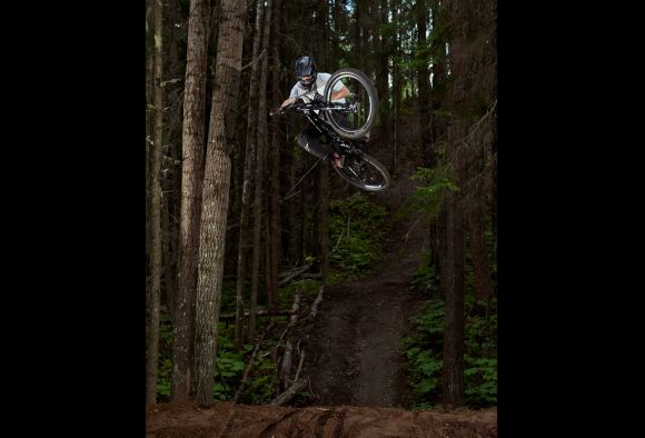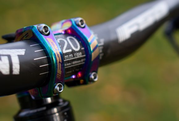 Glenn is riding a carbon Gradient Riser Bar, a custom Team Stem, a Flowtron Dropper Seatpost, carbon SL-K Crank, GRID Chainguide and also carbon Gradient Wheels.