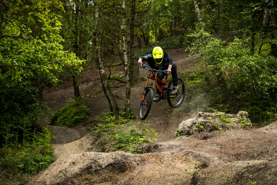 The second counter-intuitive thing is not to stare at the jump. Assess it on approach, of course, but as you hit it keep your chin up, your eyes level and focus down the trail. You’ll find balance and control follows naturally. Drop your head and you’ll likely drop your front wheel too.