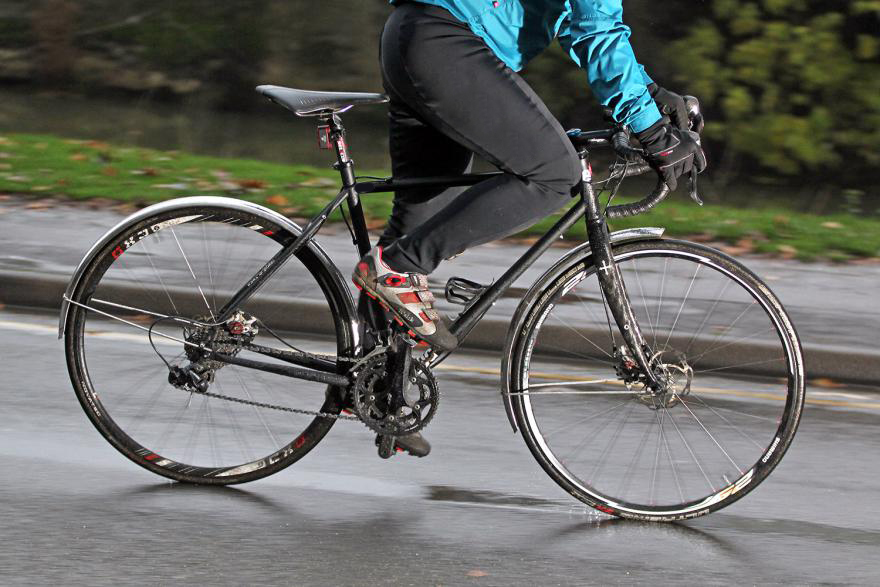 While you might run road tires at 100-120psi (6.8 bar-8.2 bar) in the dry, going as low as 80 (5.5 bar) or 90psi (6.2 bar) can help in the wet. Drag is increased over smooth surfaces, as is confidence and grip – both increase speed.