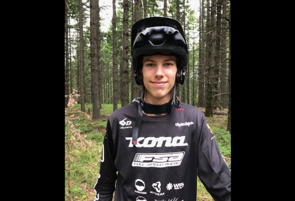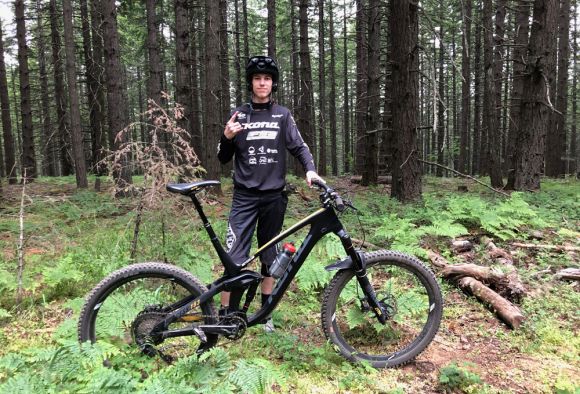 Layton is riding FSA's SL-K carbon modular cranks, GRID wheels, GRID Bar, GRID Stem, K-Force brakes and the new Flowtron dropper seatpost.